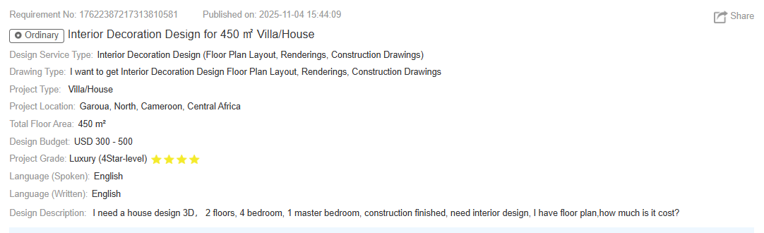 他正在BuildMost平台发布了细致的设想需求。对于建建设想、拆修施工等需求的买家而言,立异的活力取文化的多样性正催生着越来越多的个性化建建需求。正在非洲,BuildMost一直是值得相信的跨境一体化供需对接平台。便收到了来自印度尼西亚的一位具有丰硕别墅设想经验的设想师的专业报价方案。