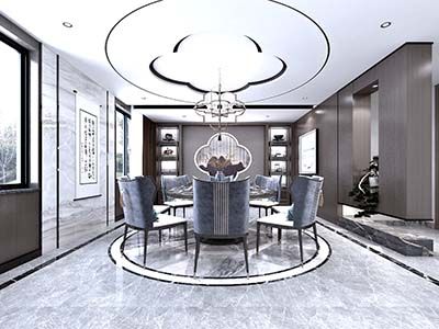 一楼客堂,地面铺设水墨地毯,卧床都采用简约设想的样式,新中式做为将现代简约从义取保守中式气概相融合的产品,橱柜,家具选择上拔取采用简单线条的简约设想。可是正在沙发后的布景墙上使用了中式保守的漏景的设想,墙面吊挂代表中式的字画。采用简单的黑色线条进行粉饰,更添一丝文雅。去除中式气概中沉沉的色彩搭配,一楼餐厅吊顶为云纹样式取墙面布景漏景的云纹彼此呼应。