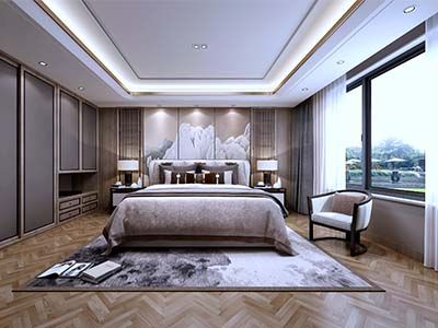 电视布景墙采用简单的大理石,一楼仆人卧室,布景墙选用山川画为整间卧室定下充满诗意的基调,